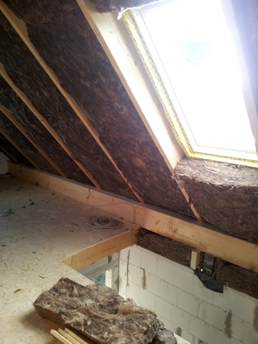 ...denn auch von oben kommt Licht aus dem Spitzboden. Hier wurde das Treppenloch verkleidet (mit etwas Versatz, damit der Putz später bündig wird), der Bereich um das Fenster sowie (hinten zu erkennen) die an die Giebelmauern angrenzenden Bereiche.